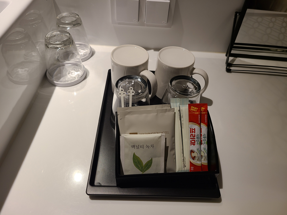 세면대 아래에는 커피포트, 타올, 헤어드라이어 등이 있습니다.