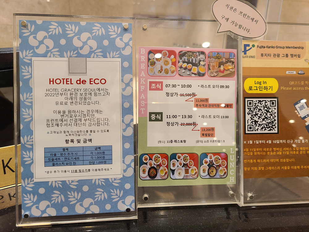 호텔 투숙객에게는 조식 식권을 할인가에 판매하므로 필요시 체크인할 때 미리 구입해 두면 좋겠죠.