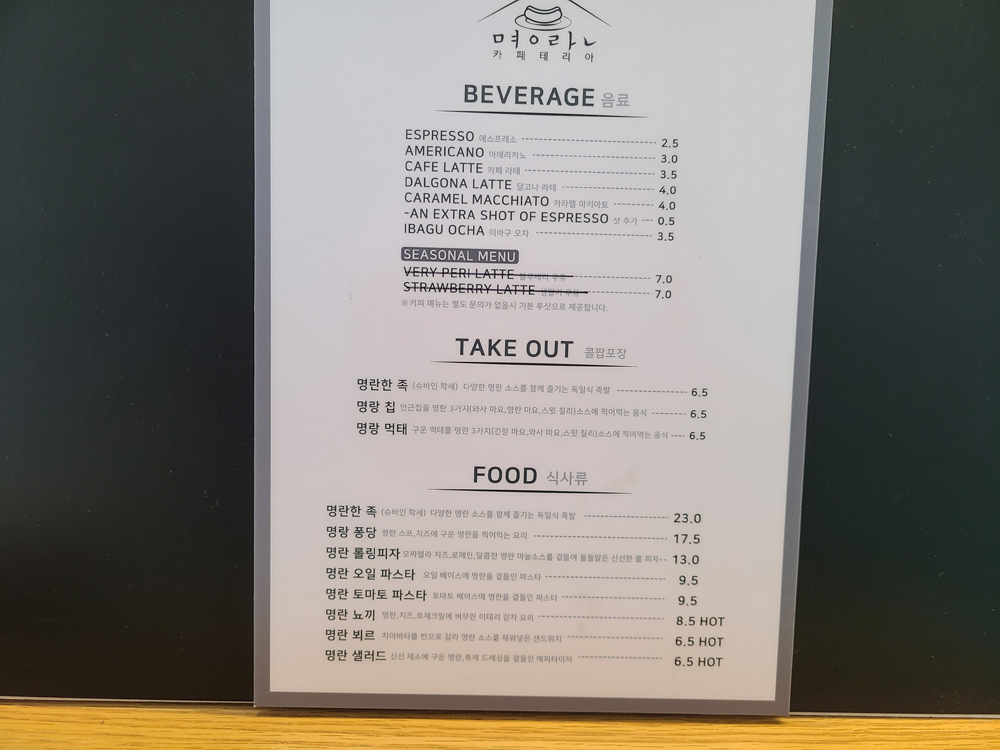 아메리카노가 3,000원으로 아주 착한 가격이고 라떼도 3,500원이면 됩니다.