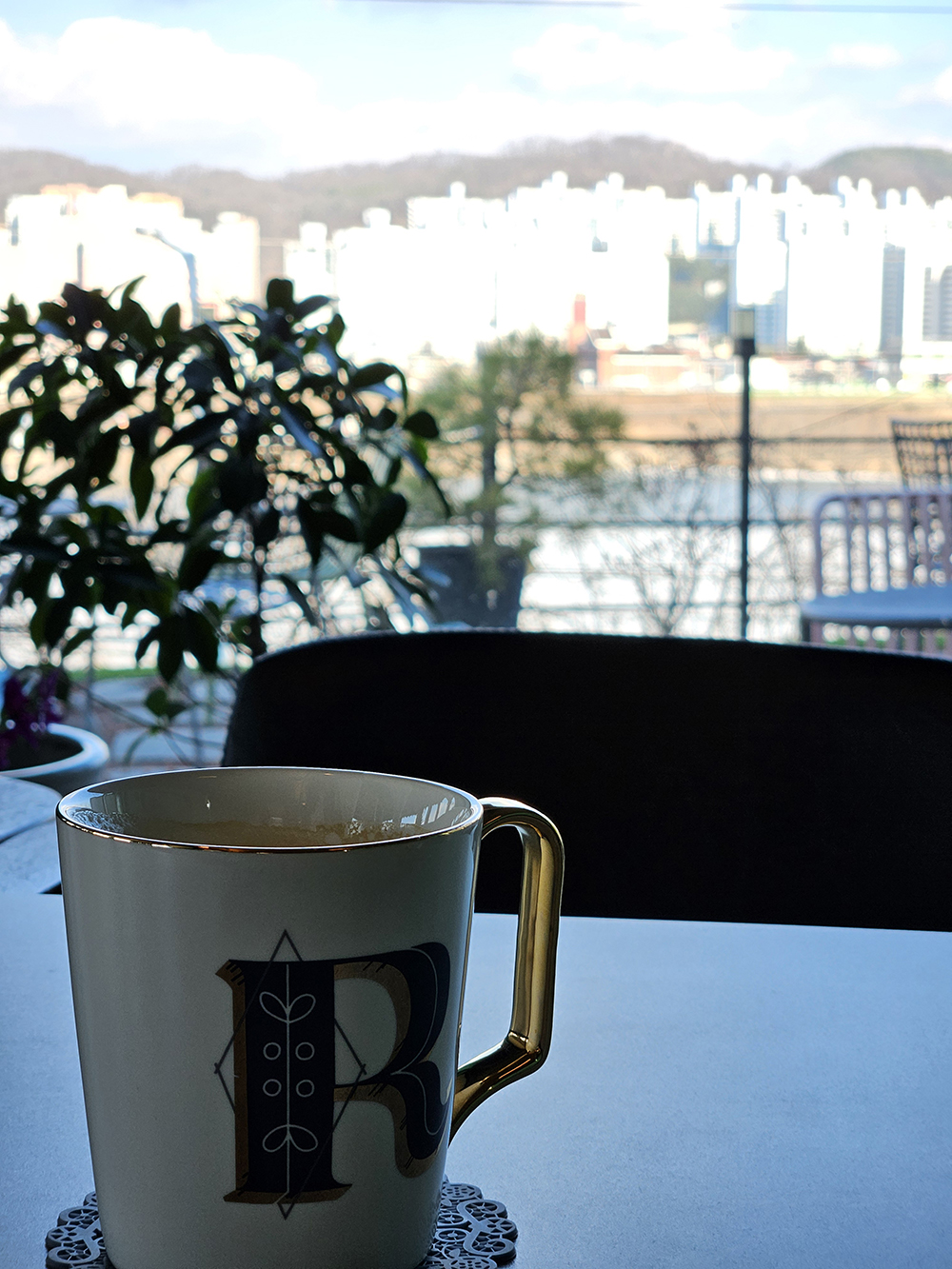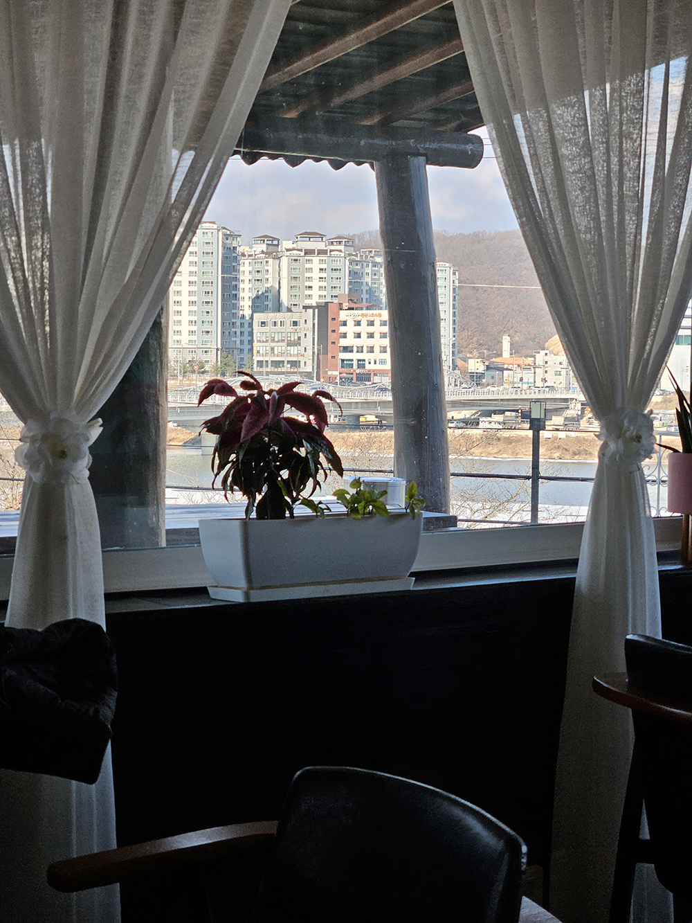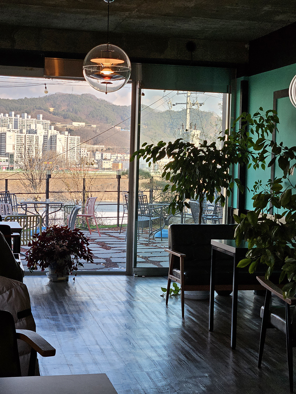 카페는 강변쪽 도심을 바라보는 위치에 자리잡고 있어요.