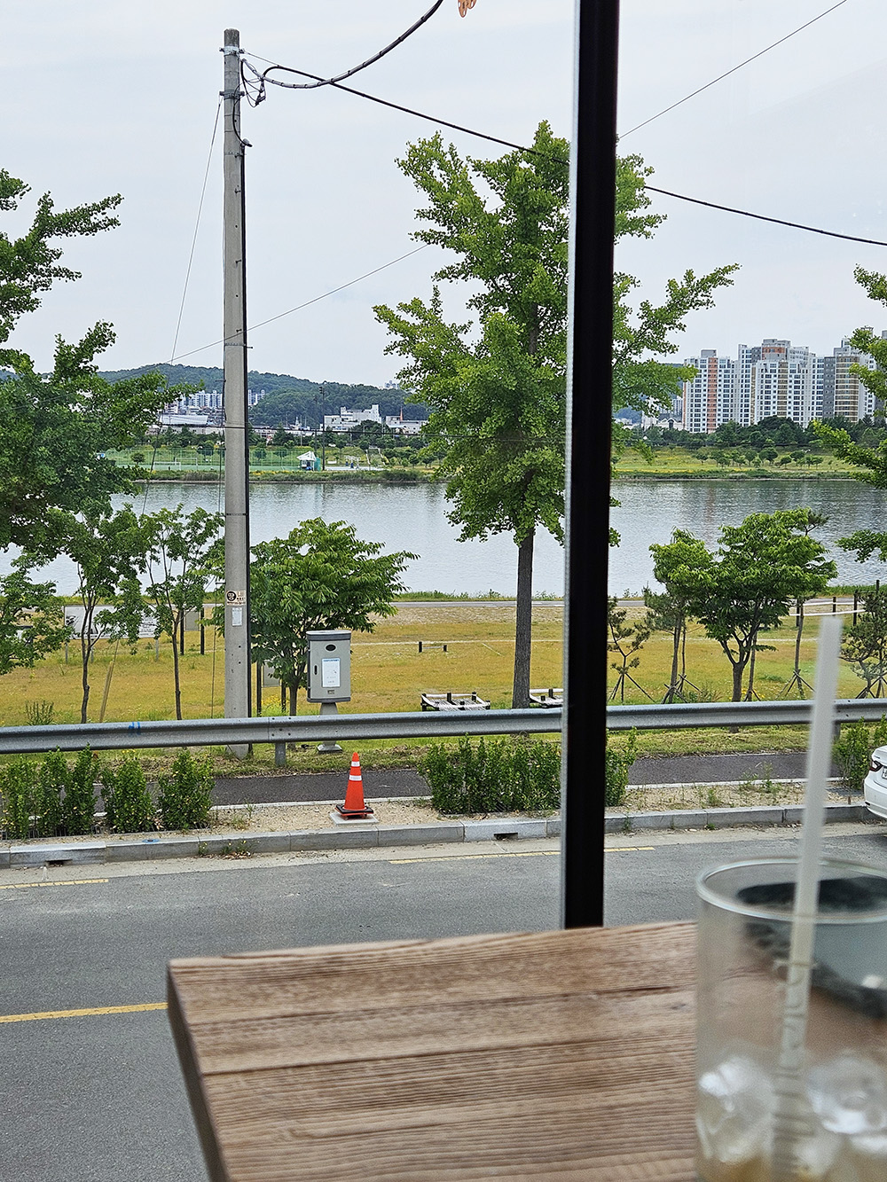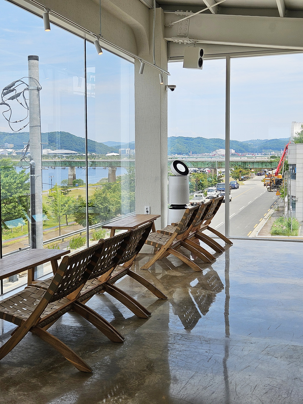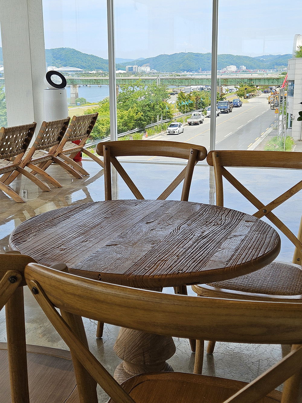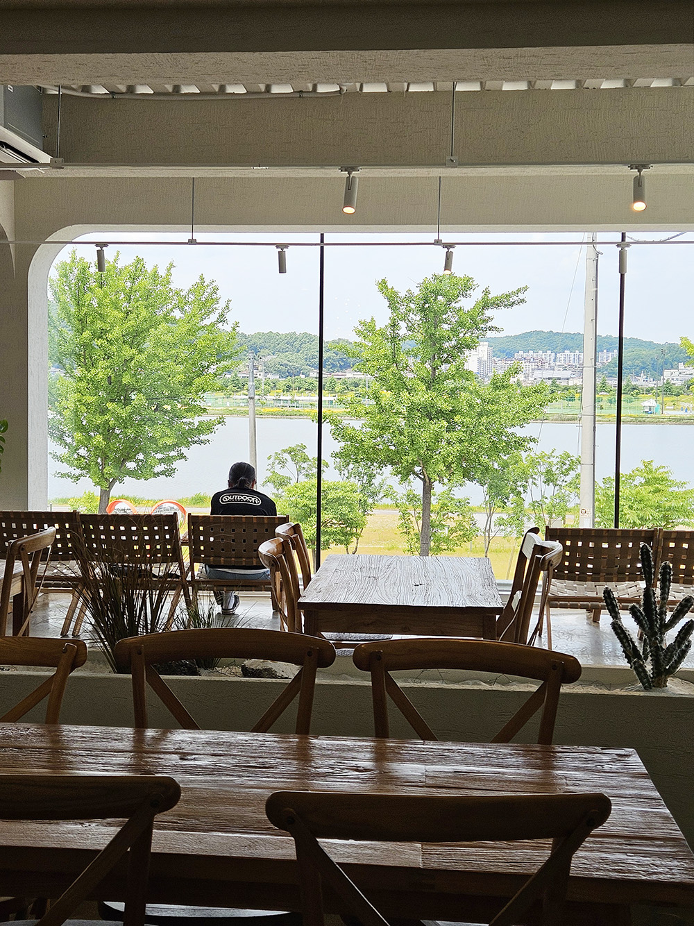 넓은 창가와 통창으로 들어오는 자연 채광이 카페를 환하게 밝혀주고, 낙동강을 바라볼 수 있는 창가 테이블은 정말 멋진 공간이예요.