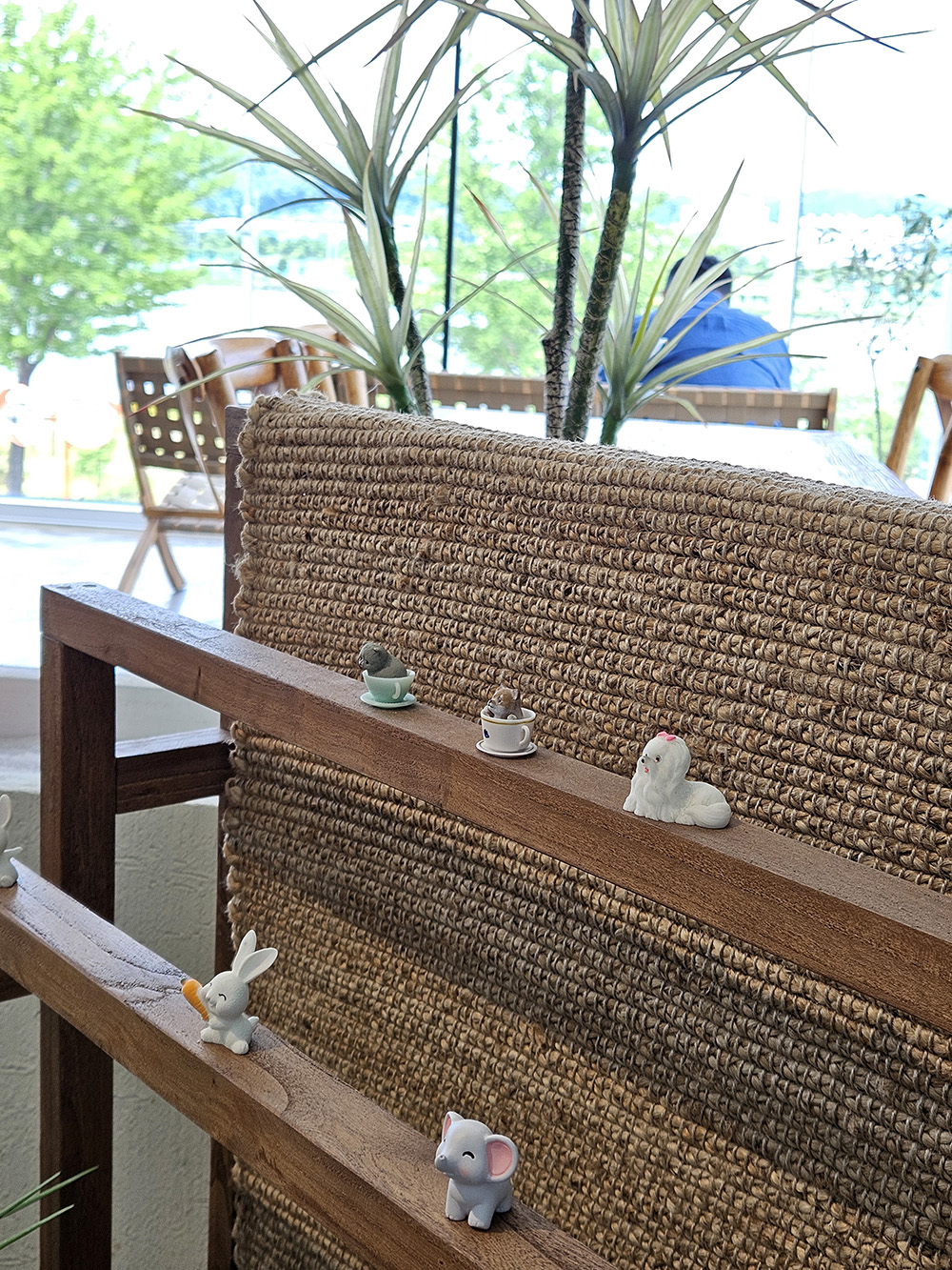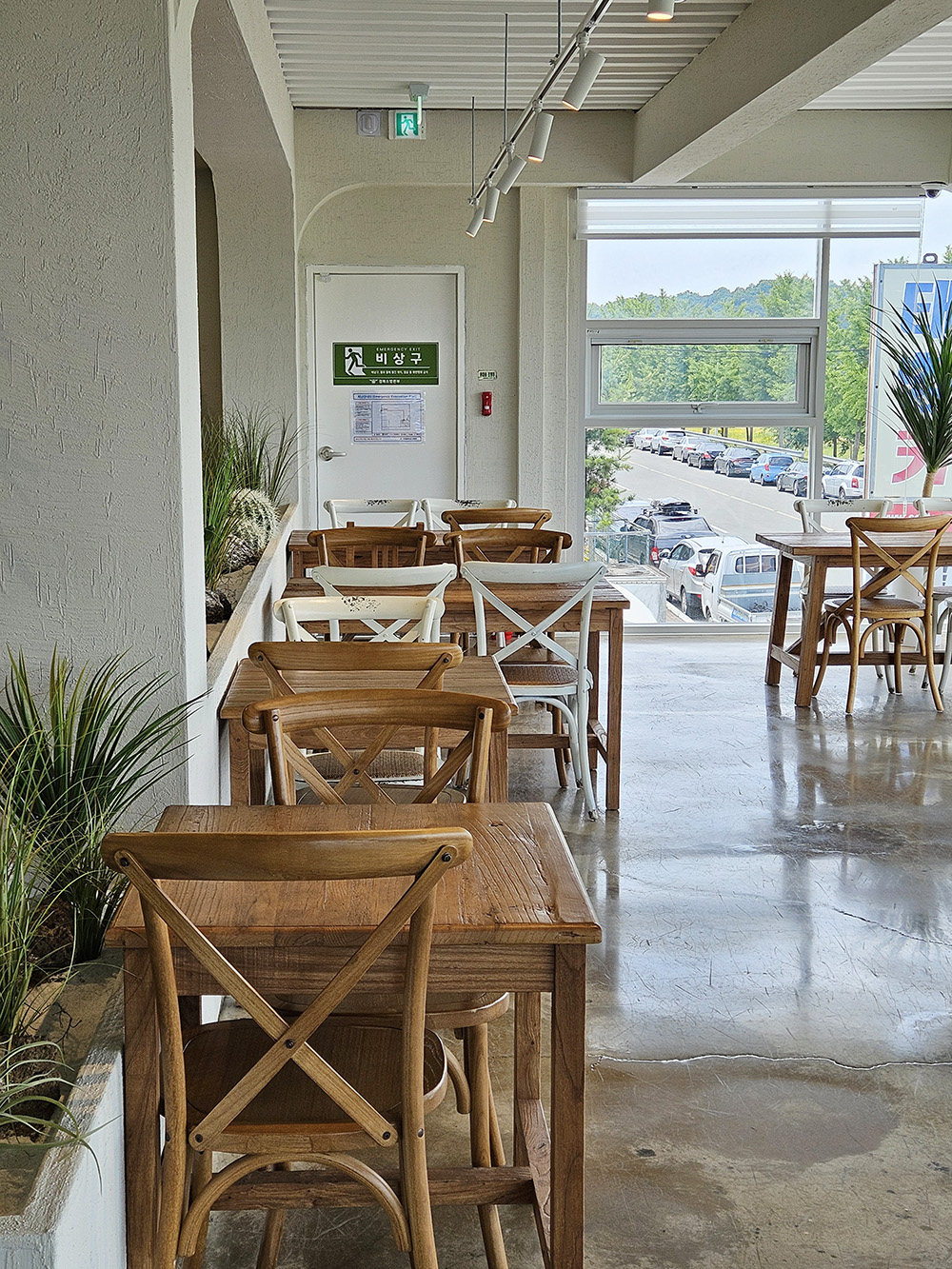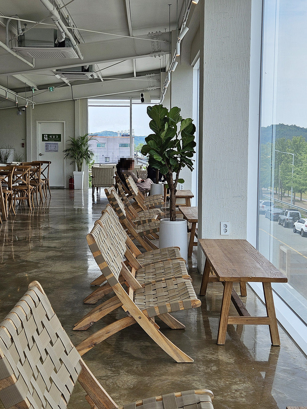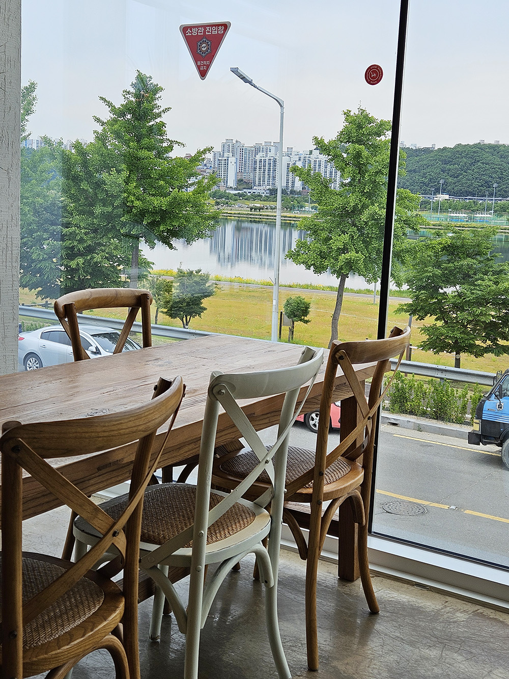넓은 창가와 통창으로 들어오는 자연 채광이 카페를 환하게 밝혀주고, 낙동강을 바라볼 수 있는 창가 테이블은 정말 멋진 공간이예요.