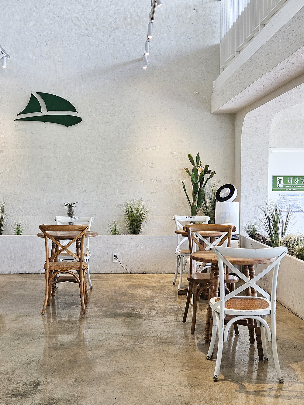 배의 돛을 형상화한 짙은 초록색 로고가 카페 이름과 무척 잘 어울린답니다.
