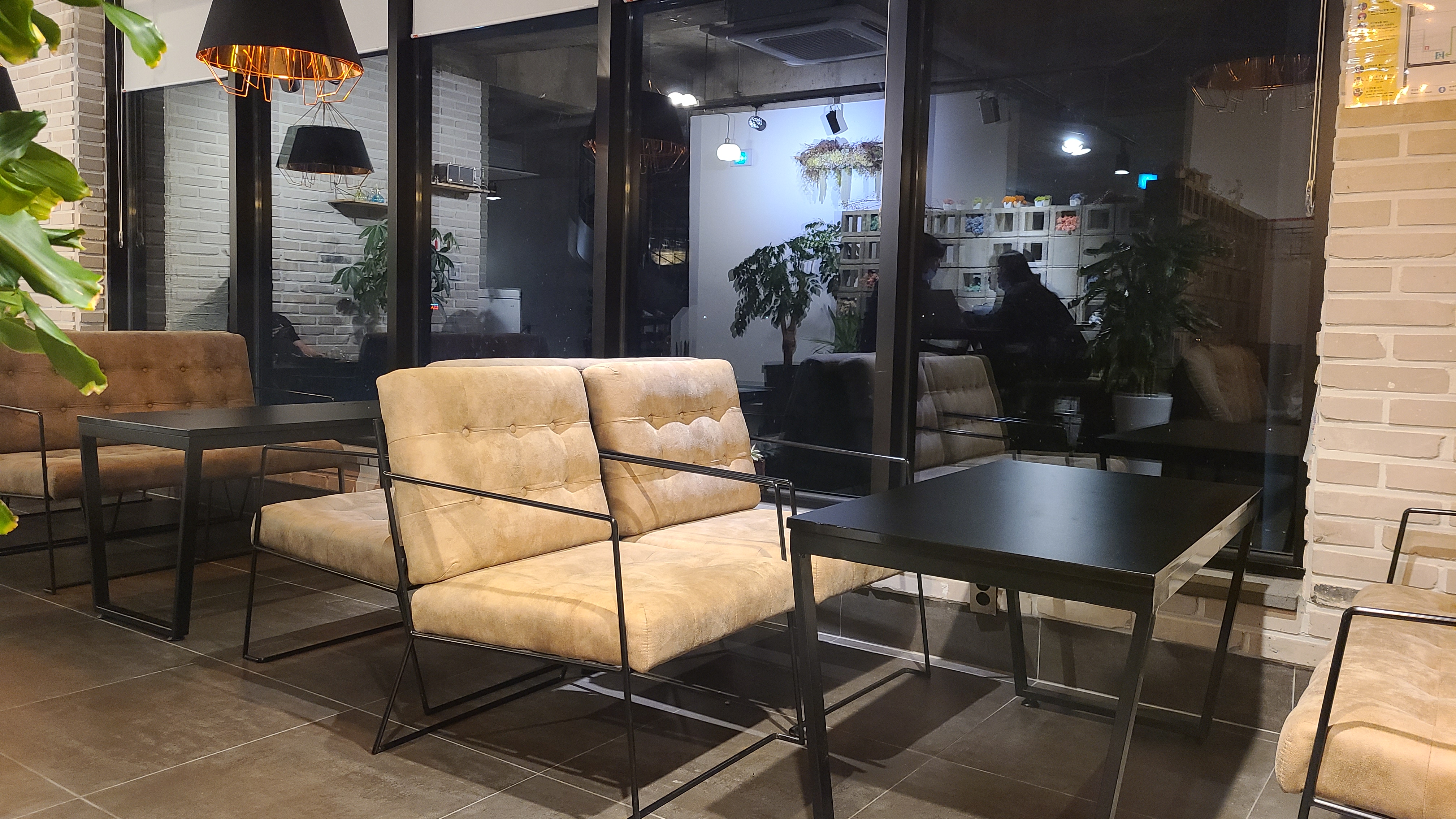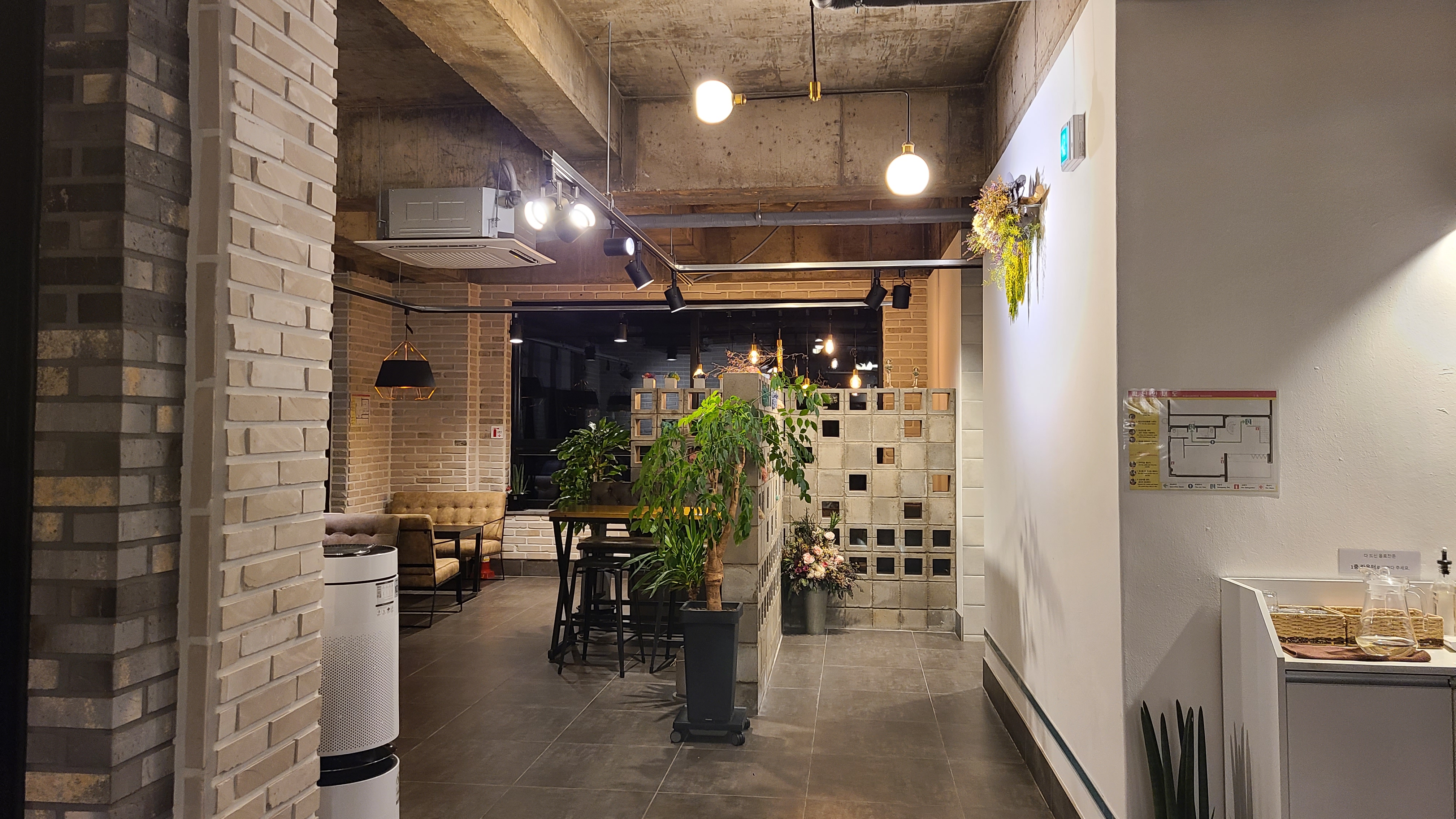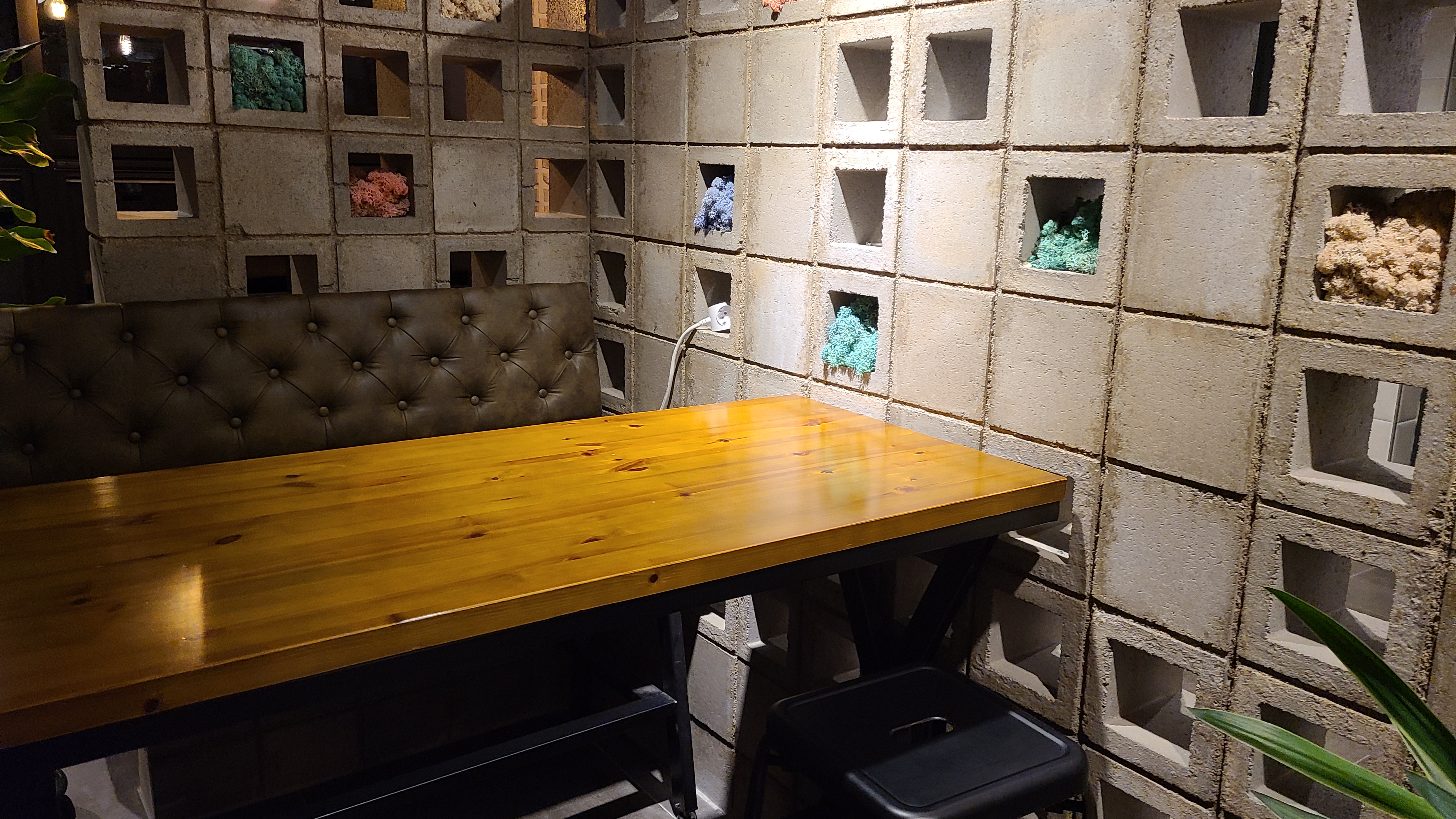 노출 콘크리트로 별다른 마감을 하지 않은 천장과 큐블럭을 쌓아 만든 칸막이로 스모키한 느낌이 강합니다.