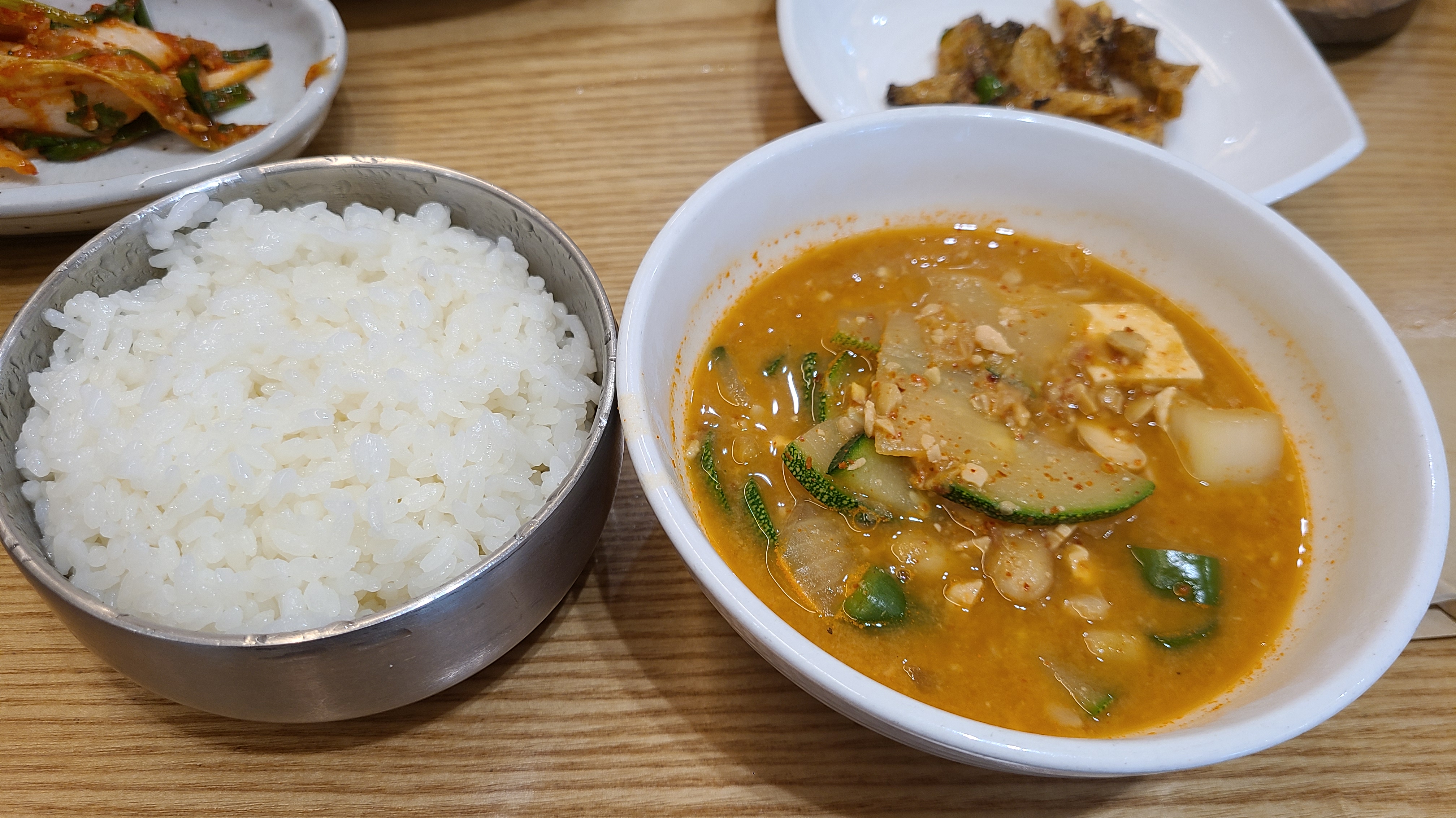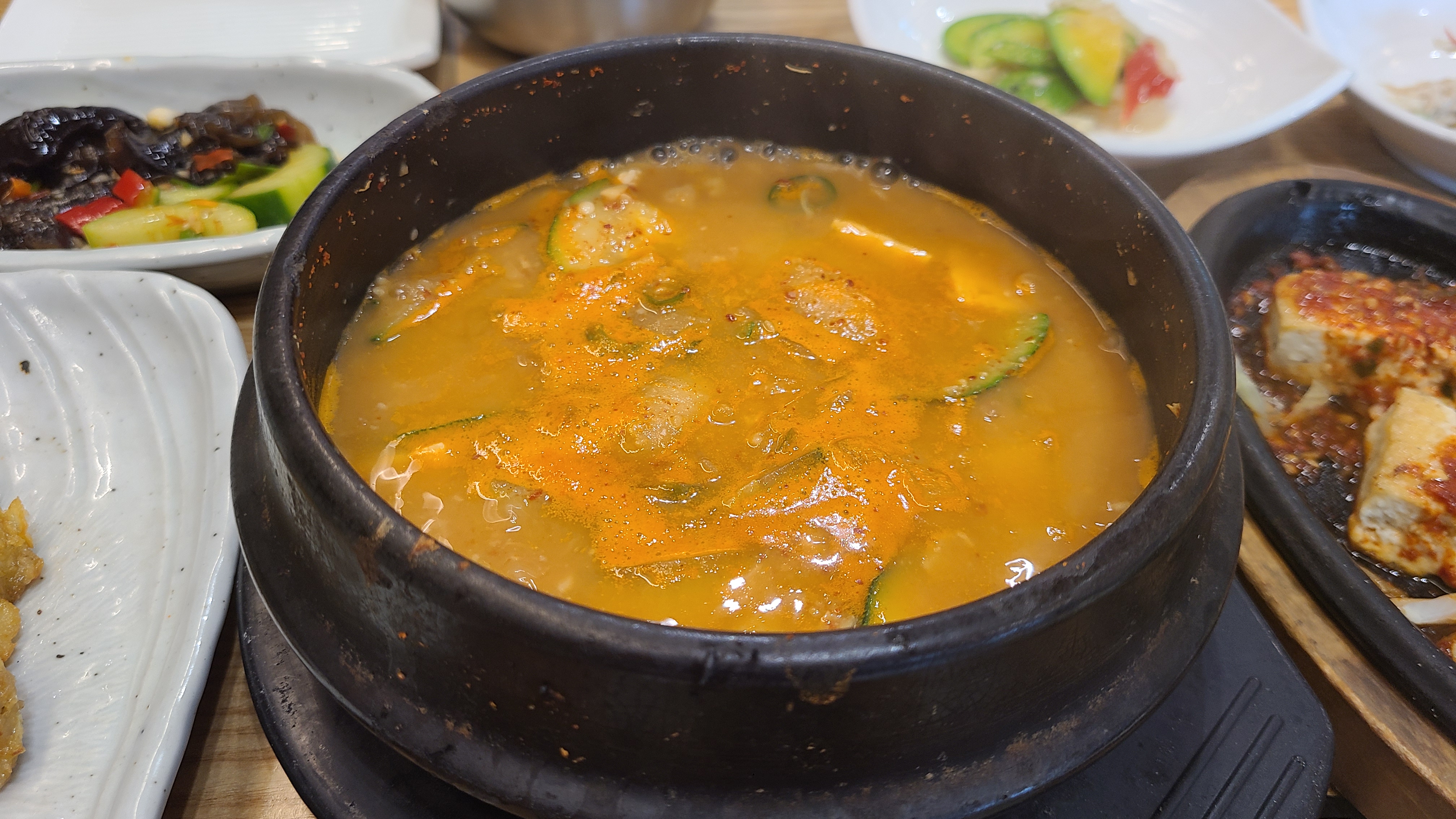 두부와 호박을 넣은 청국장인데, 된장찌개 느낌으로 걸쭉하지는 않습니다.