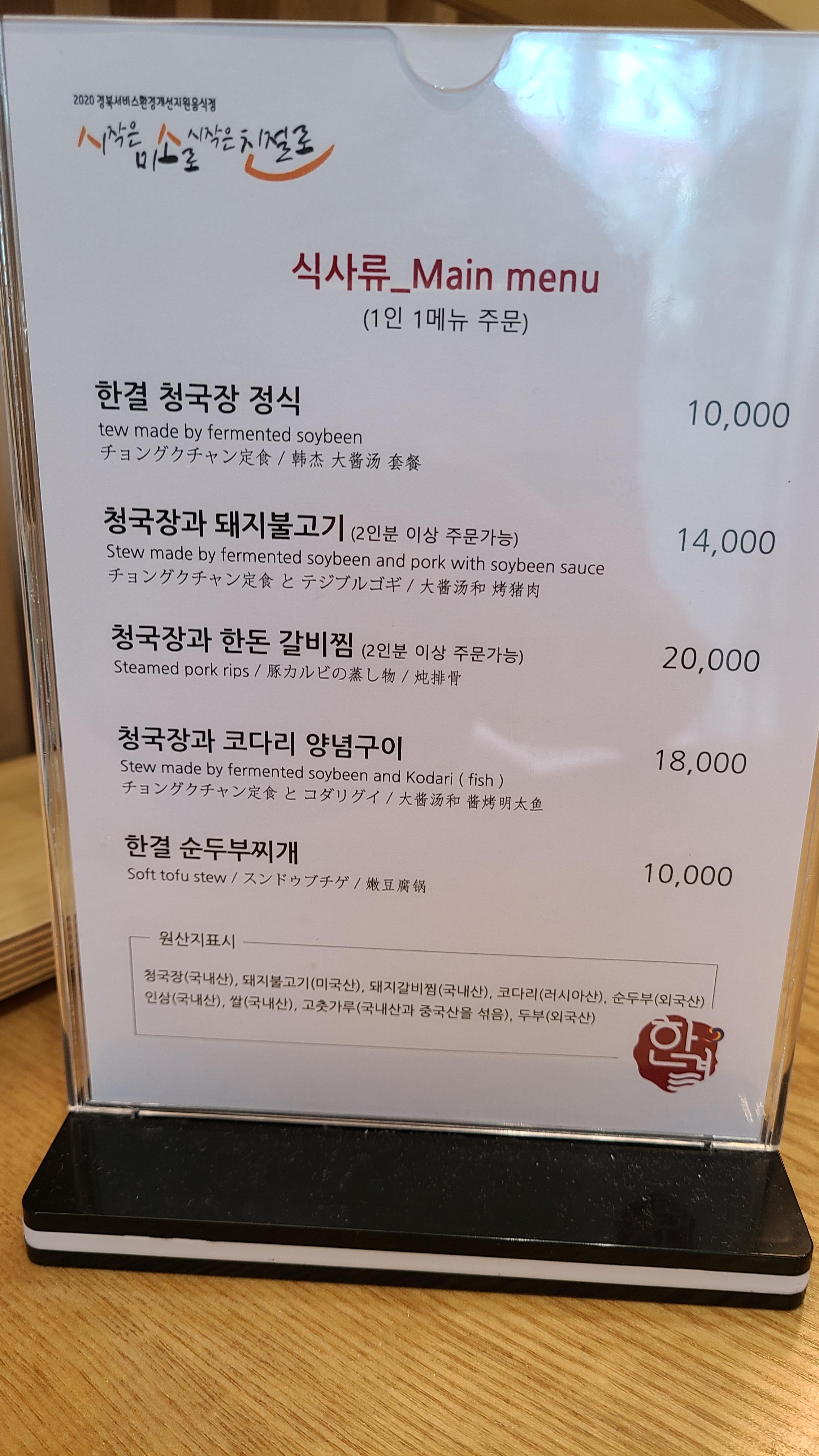 한결청국장 메뉴
