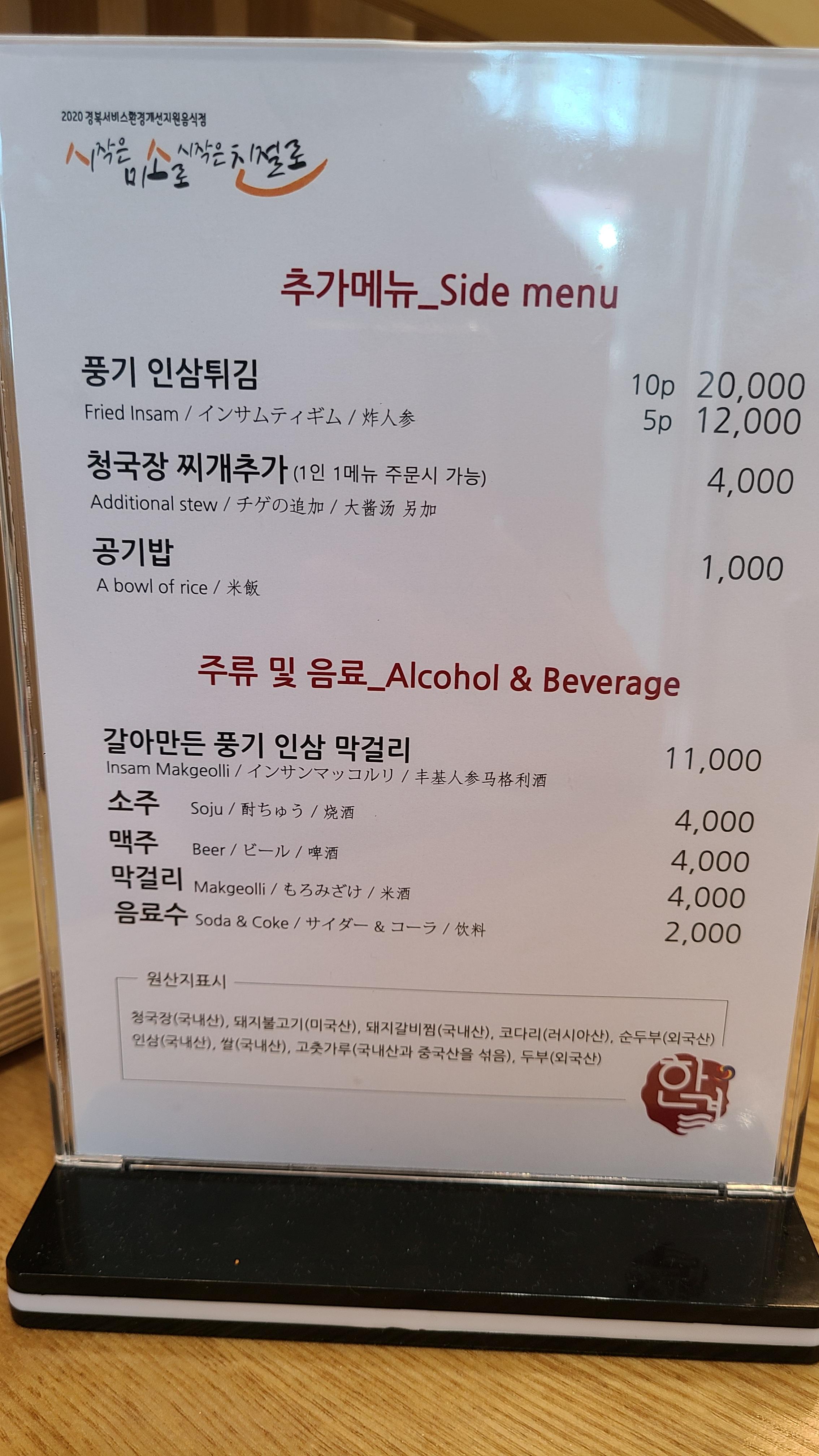 주류로는 풍기인삼 막걸리가 눈에 띄는군요.