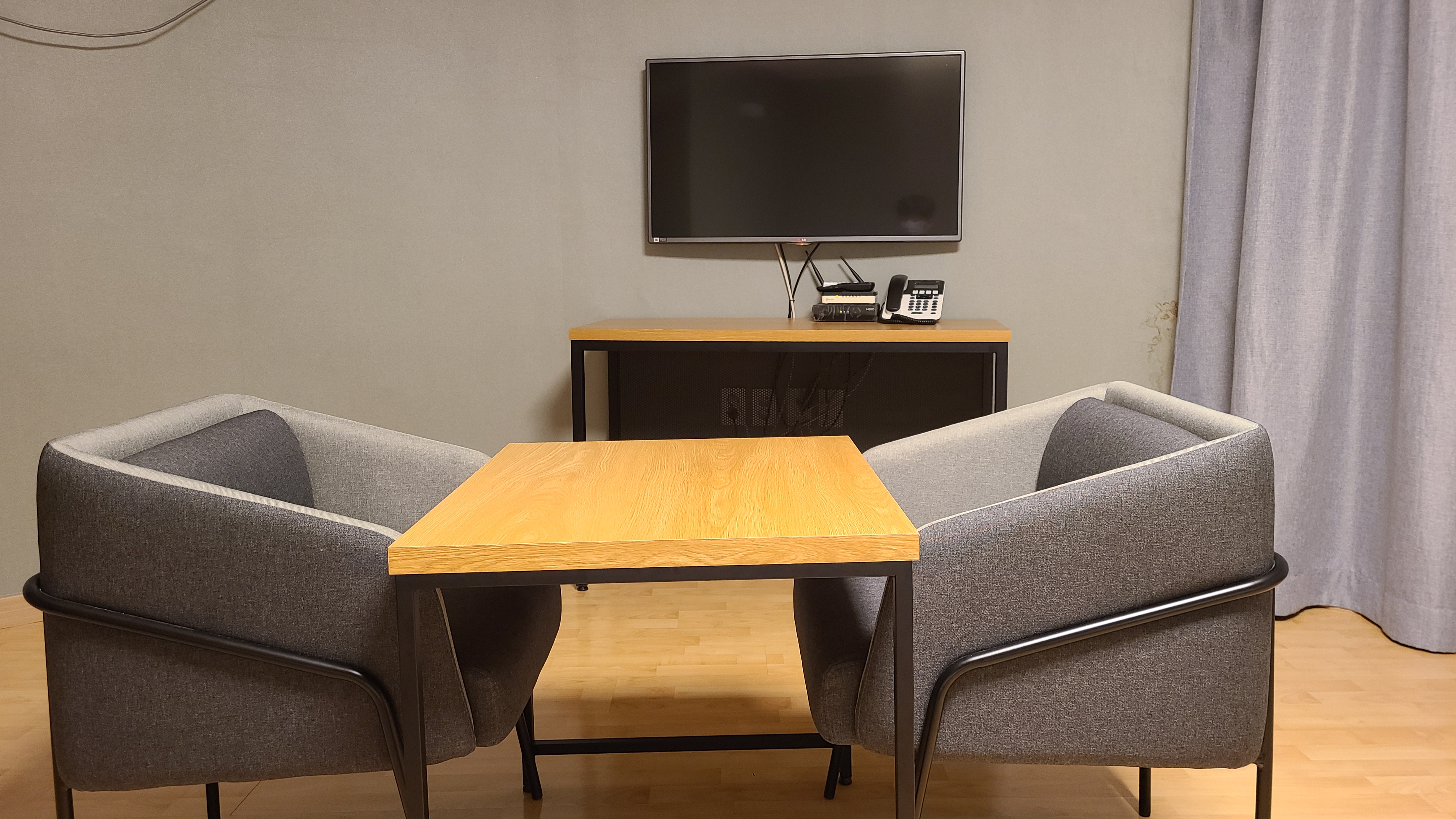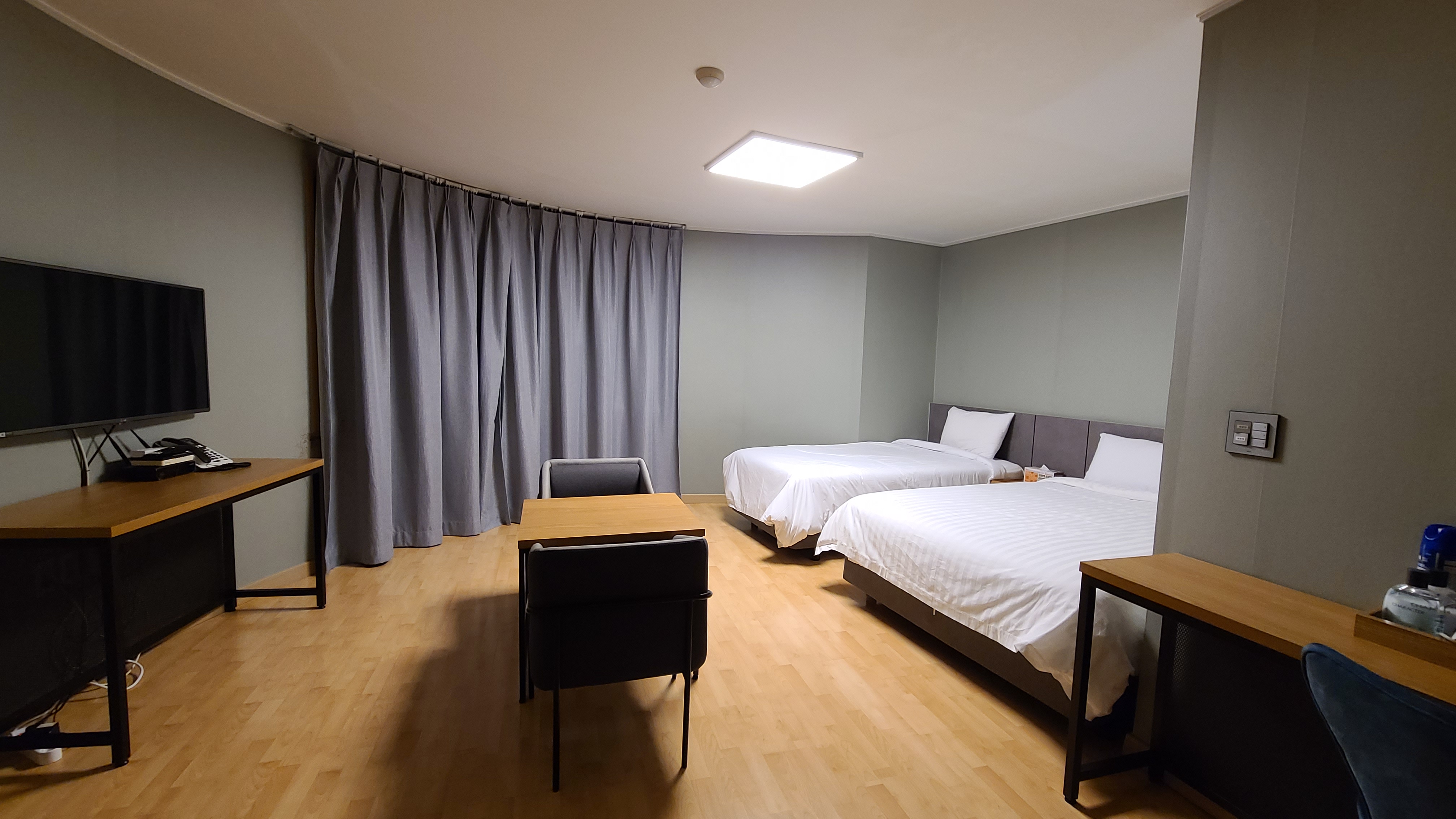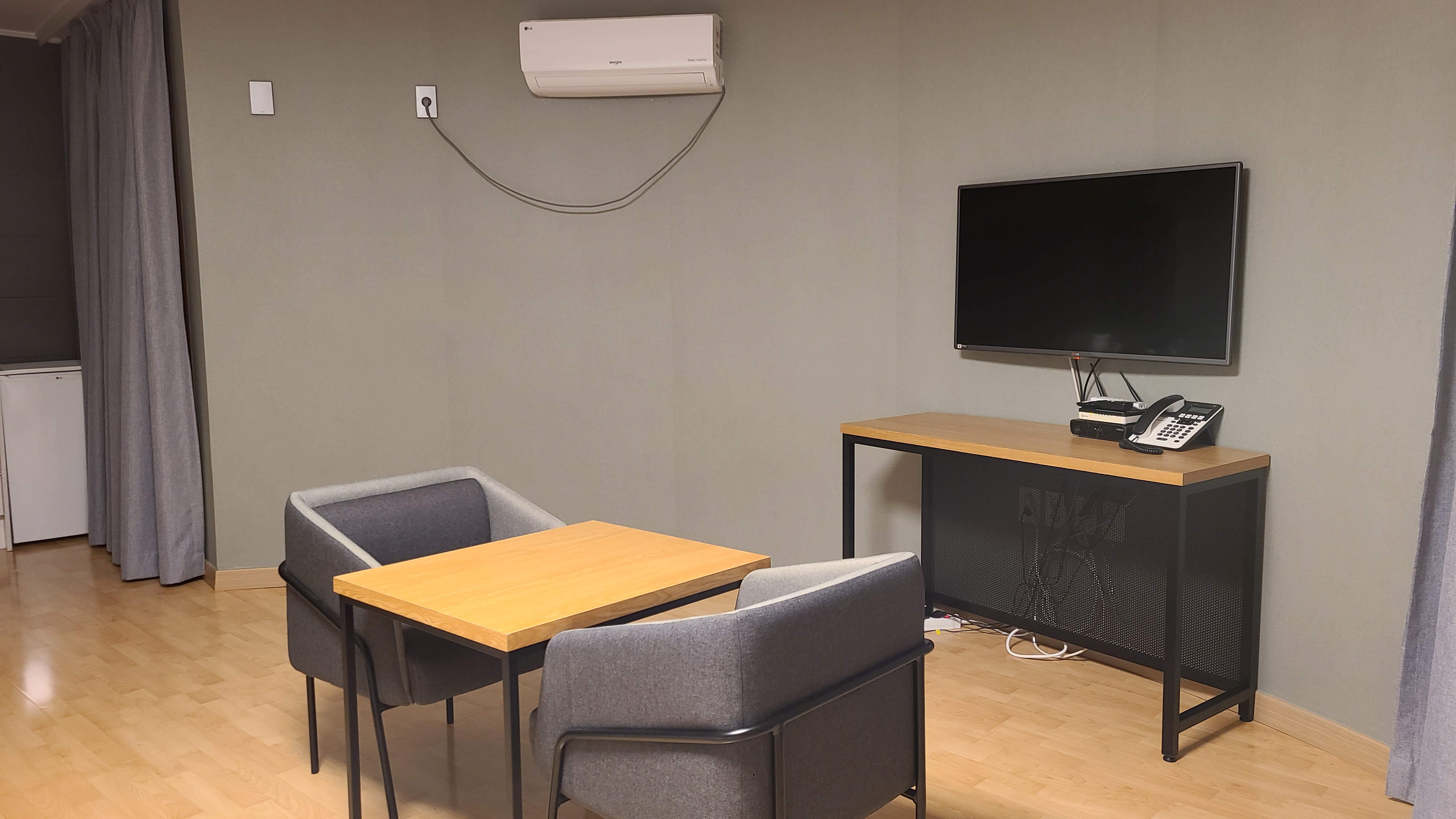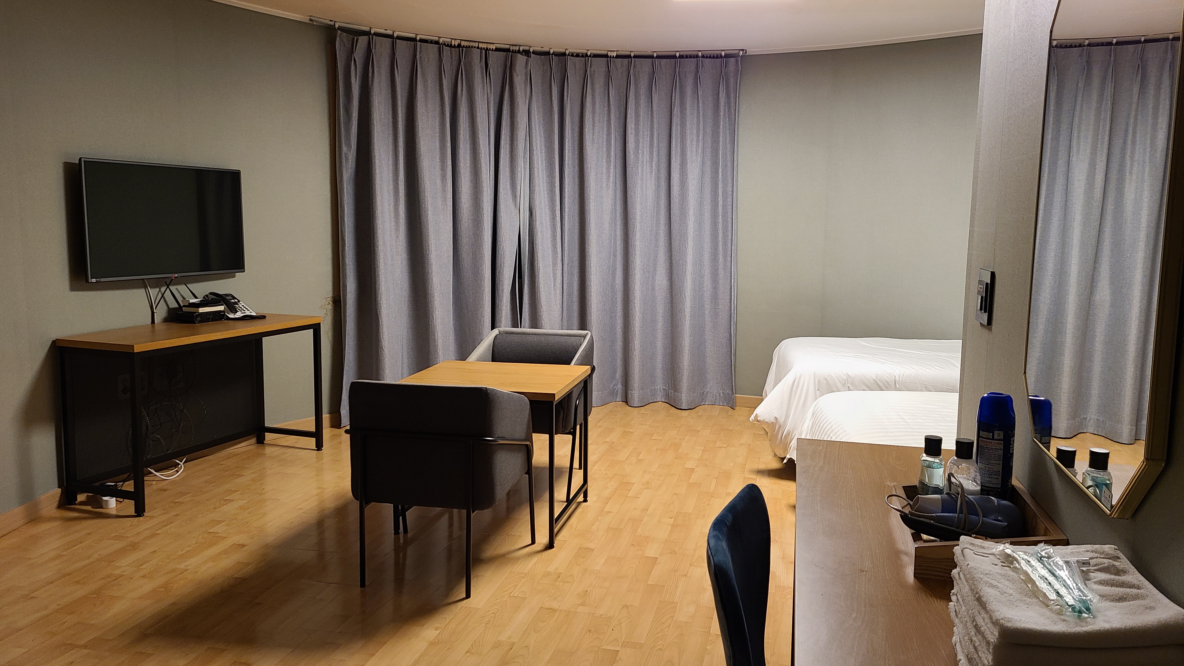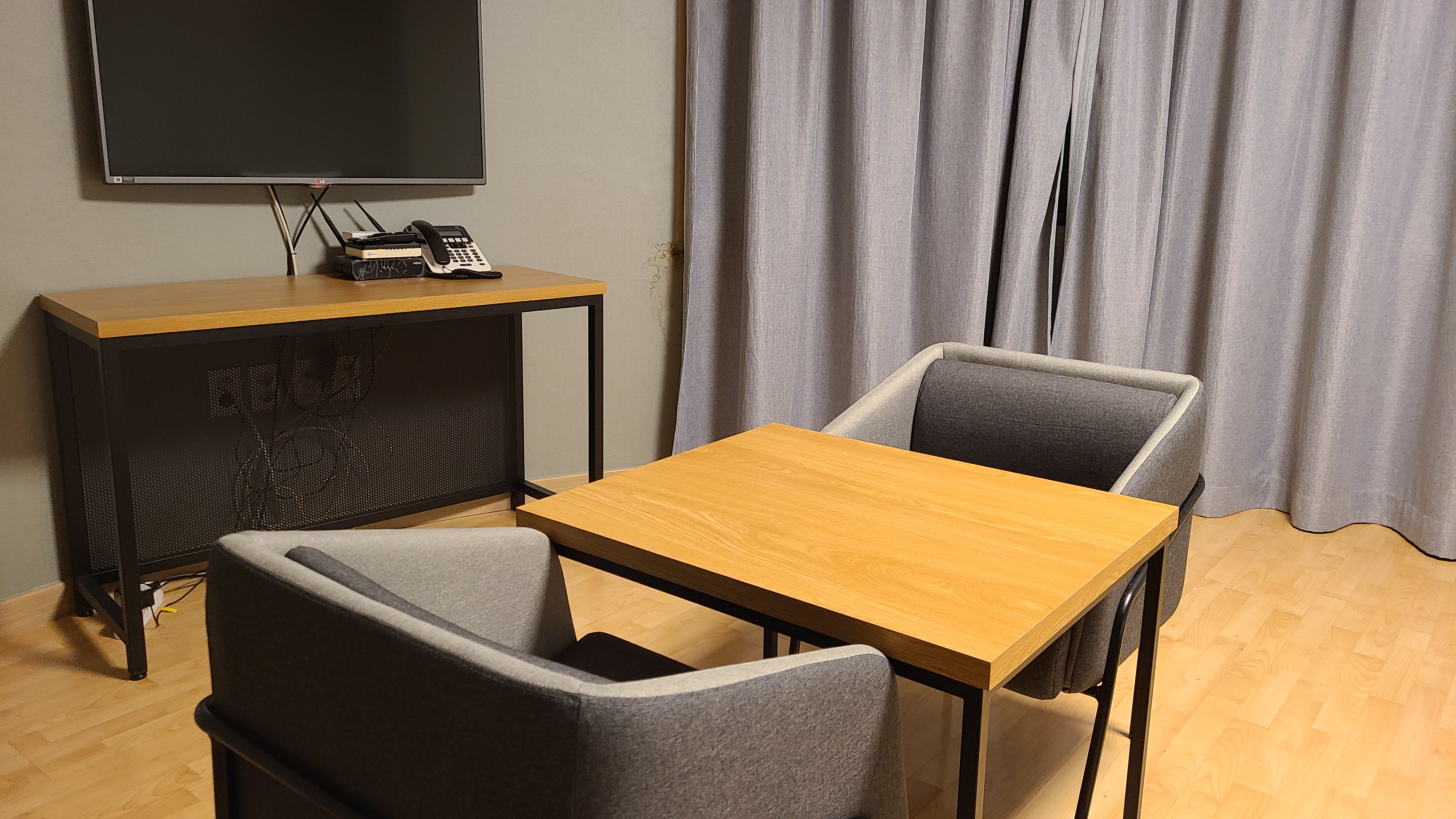 테이블이 있어서 방이 좁아 보이는데 전혀 좁지 않아요.
