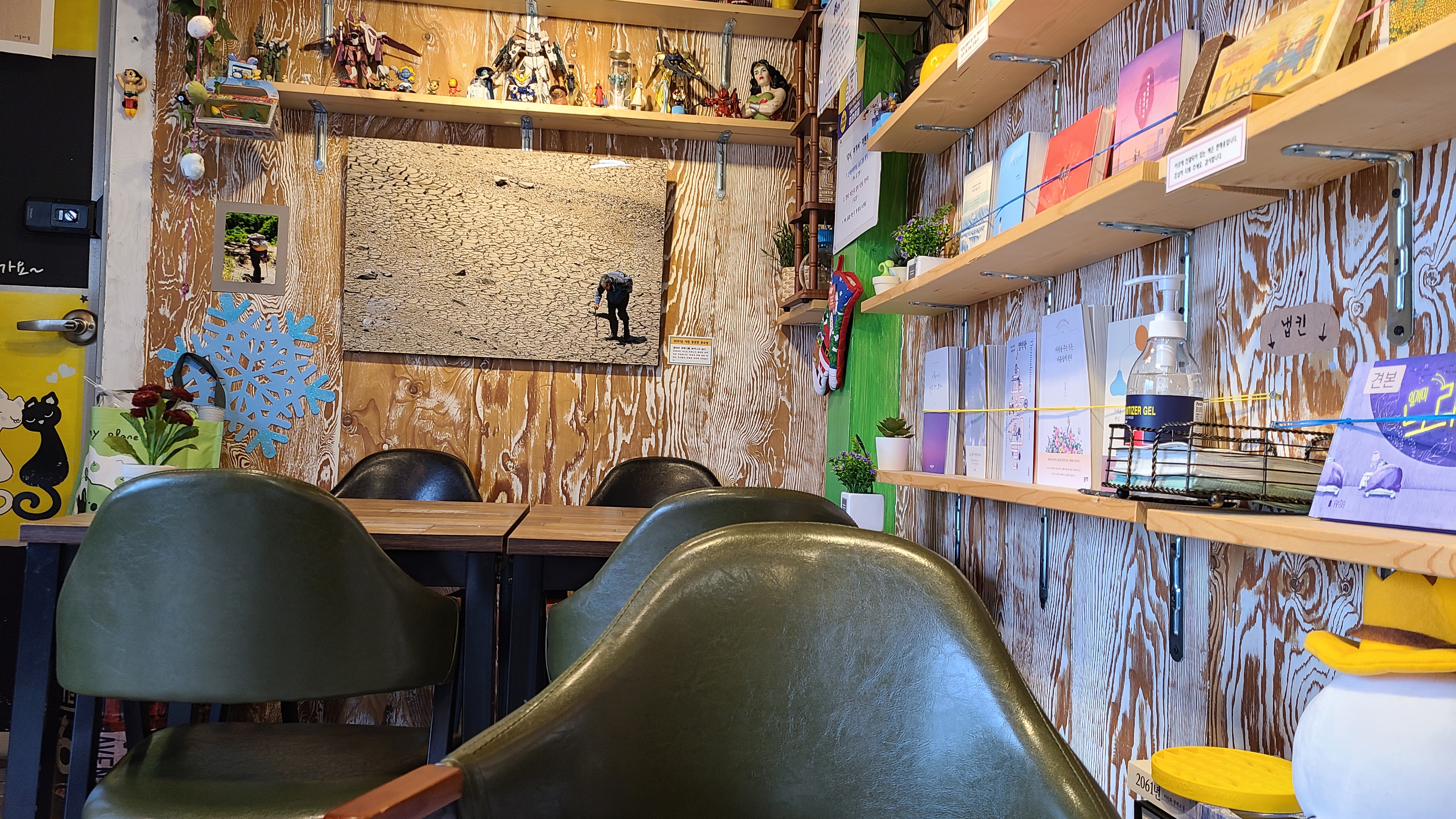 카페 한쪽 벽면에는 사장님이 직접 큐레이션한 책이 보기좋게 진열되어 있어요.