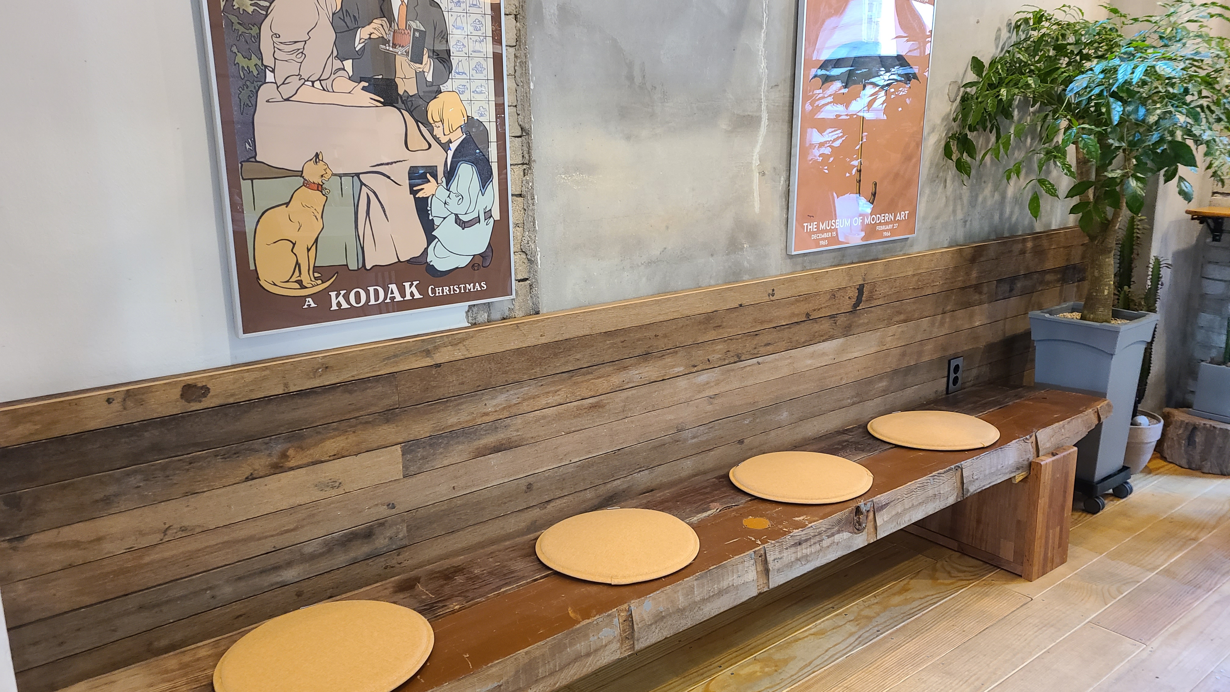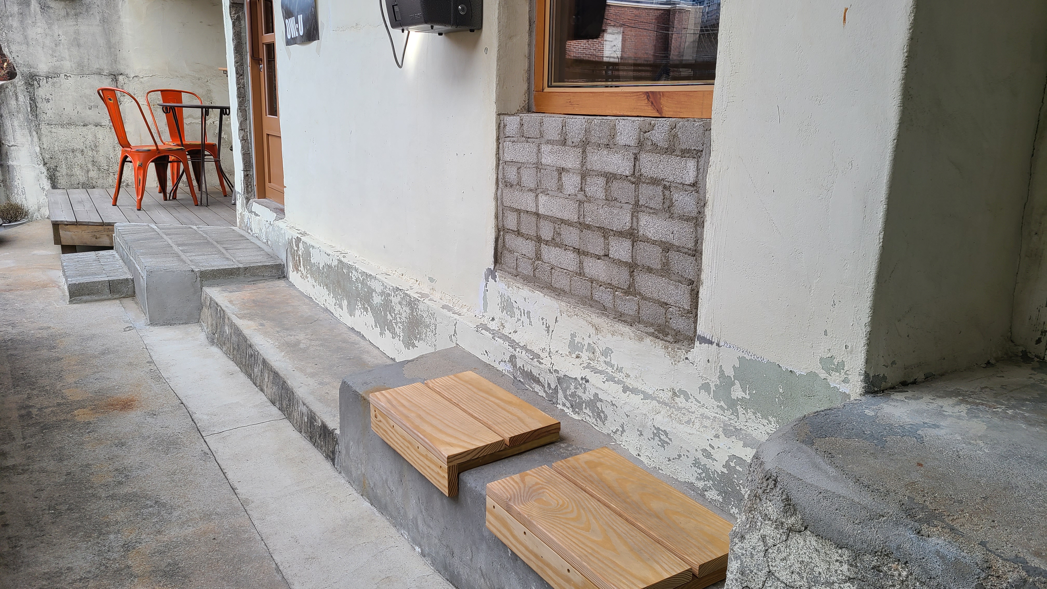 단정한 나무 창틀과 걸터앉기 좋은 나무 의자가 있는 카페 입구입니다.