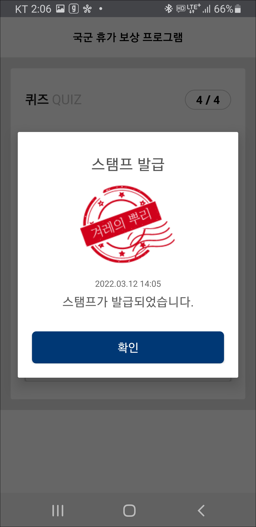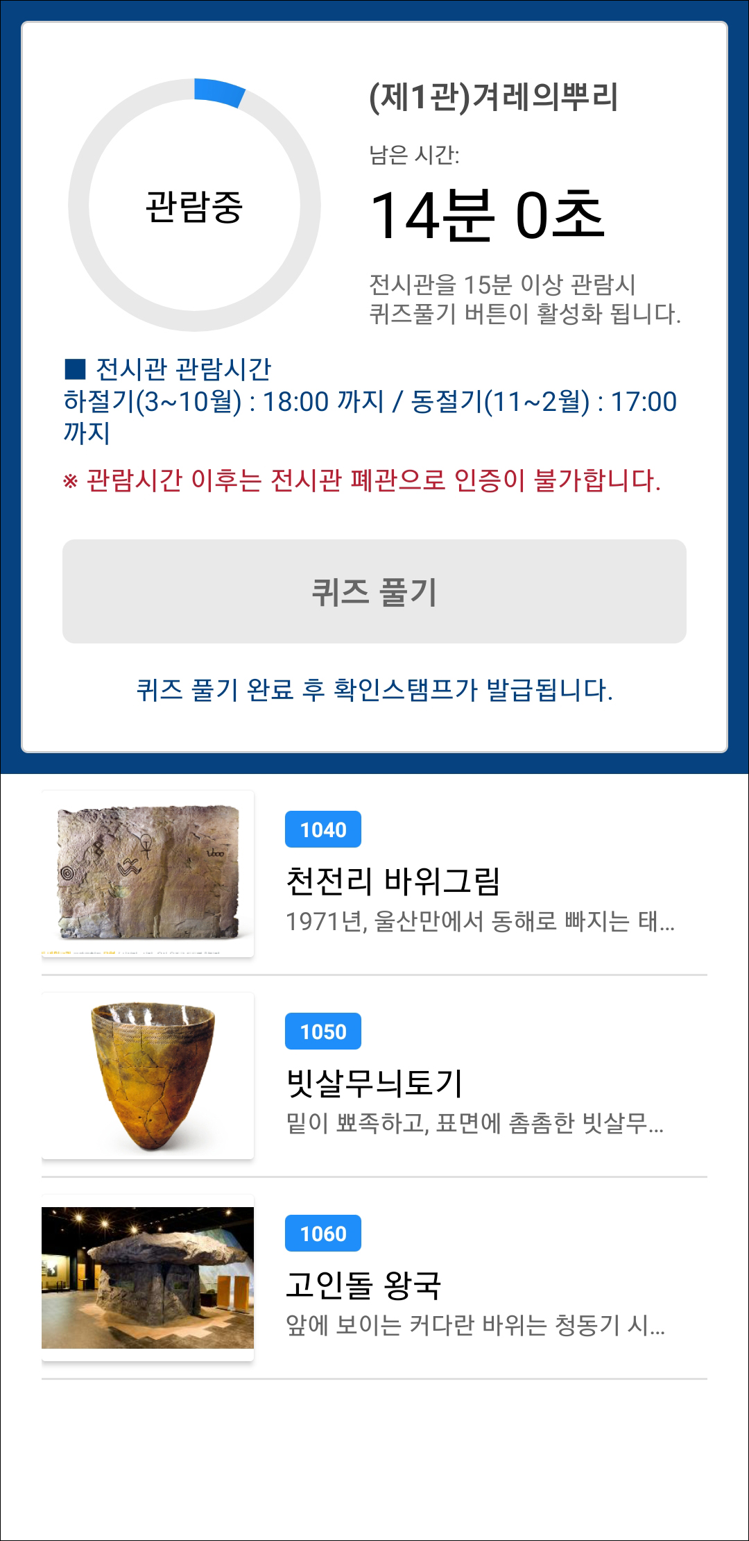 퀴즈를 모두 풀면 해당 전시관의 스탬프 발급 창이 뜹니다.