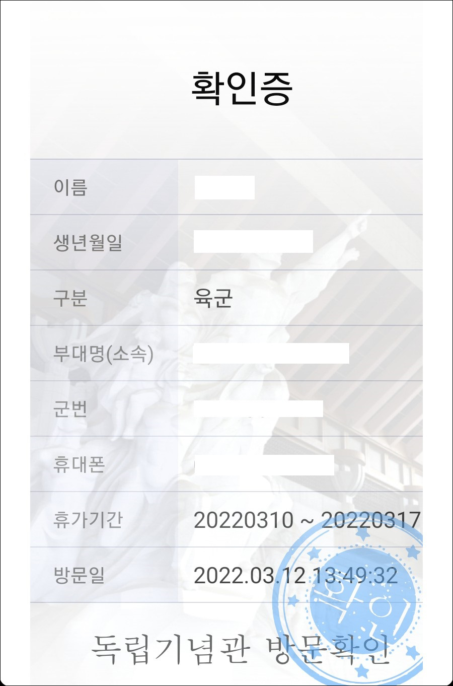 [현충시설 기념관 안내]라는 앱을 깔고 독립기념관을 검색해서 들어간 뒤 국군 휴가 인증 창에서 군번과 이름 등의 정보를 입력하고 전시관에 입장을 하면 됩니다.