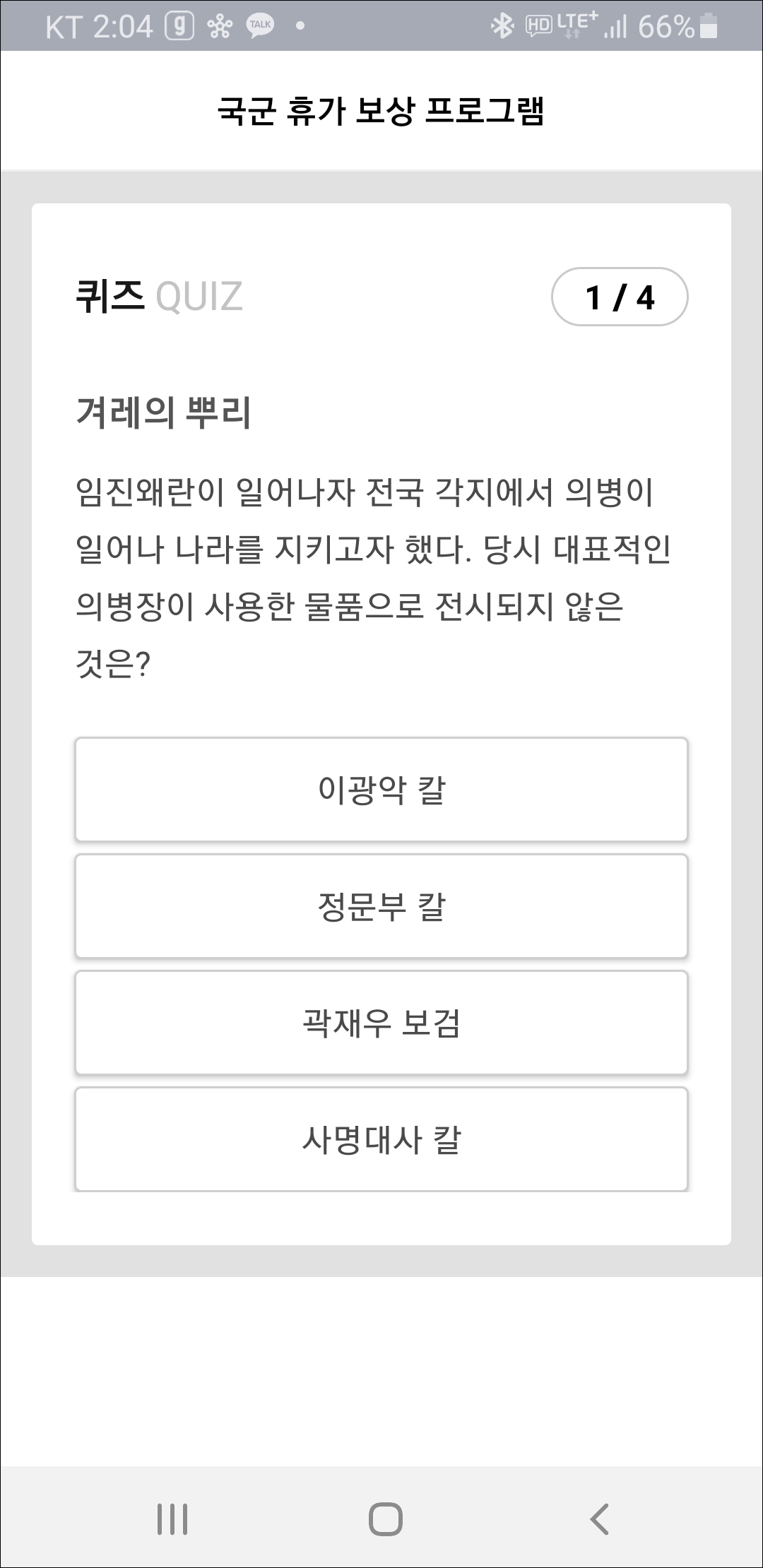 타이머를 다 채우고 나면 아래와 같이 퀴즈를 푸는 창이 뜹니다.